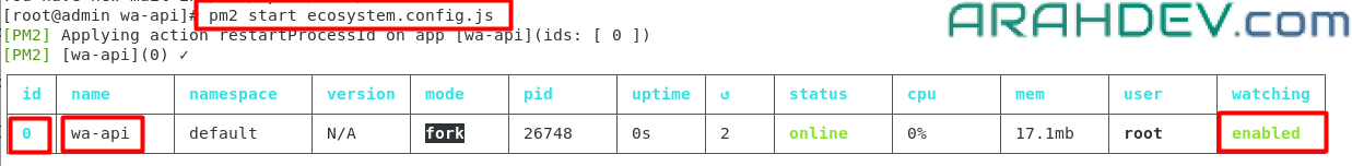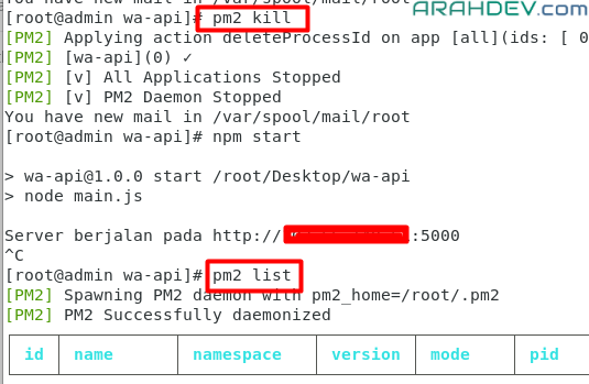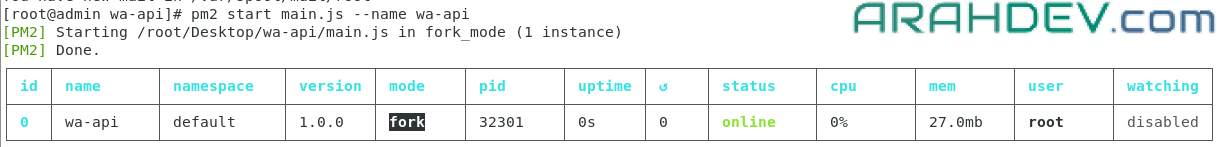 pm2 start main.js --name wa-api- jika seperti gambar dibawah maka aplikasi sudah berhasil dijalankan