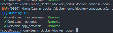 docker compose down- Menghentikan dan menghapus semua layanan, jaringan, dan volume yang dibuat oleh Compose.