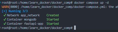- docker-compose.yml telah berhasil dijalankan dengan mengaktifkan network, dan 2 container (fastapi-app dan mongodb)