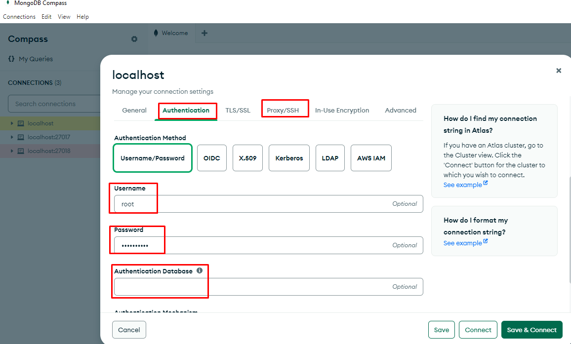 - pada bagian authentication masukkan username dan password yang sudah didefine di file docker-compose.yml untuk database nya dikosongkan saja.