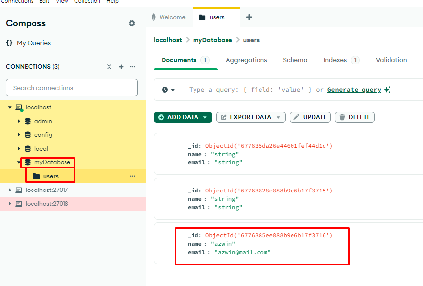 - setelah dilakukan insert maka otomatis database dan collection akan dibuat