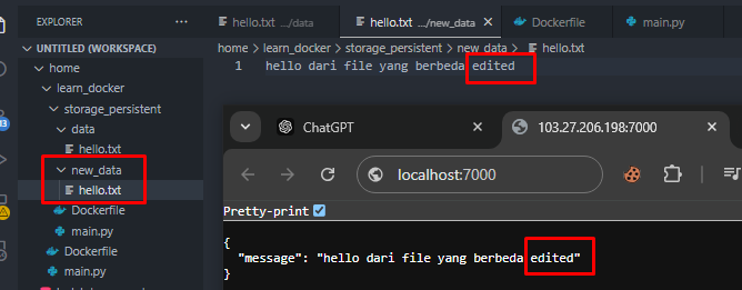 ketika kita melakukan edit pada filenya kemudian kita refresh halamannya, maka otomatis tulisan yang ditampilkan akan berubah tanpa harus merestart container nya