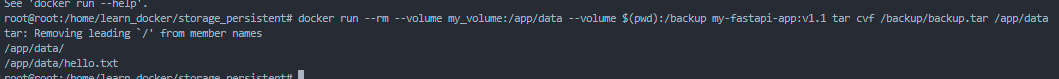 docker run --rm --volume my_volume:/app/data --volume $(pwd):/backup my-fastapi-app:v1.1 tar cvf /backup/backup.tar /app/dataketerangan