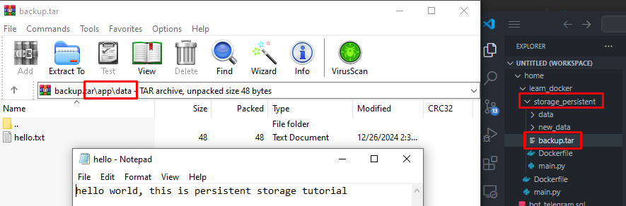 tar xvf /backup/backup.tar -C /app/datataradalah perintah dalam container untuk mengekstrak arsipbackup.tar:x: Mengekstrak file dari arsip.v: Menampilkan daftar file saat diekstrak (verbose).f: Menentukan nama file arsip (/backup/backup.tar).-C /app/data: Mengubah direktori kerja ke/app/datasebelum mengekstrak file, sehingga file dipulihkan langsung ke lokasi volume.