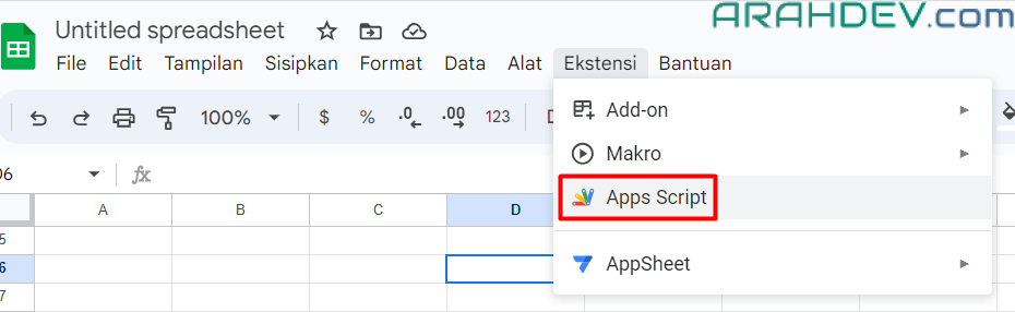 - pada menu ekstensi, pilih app script