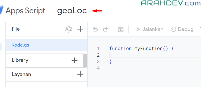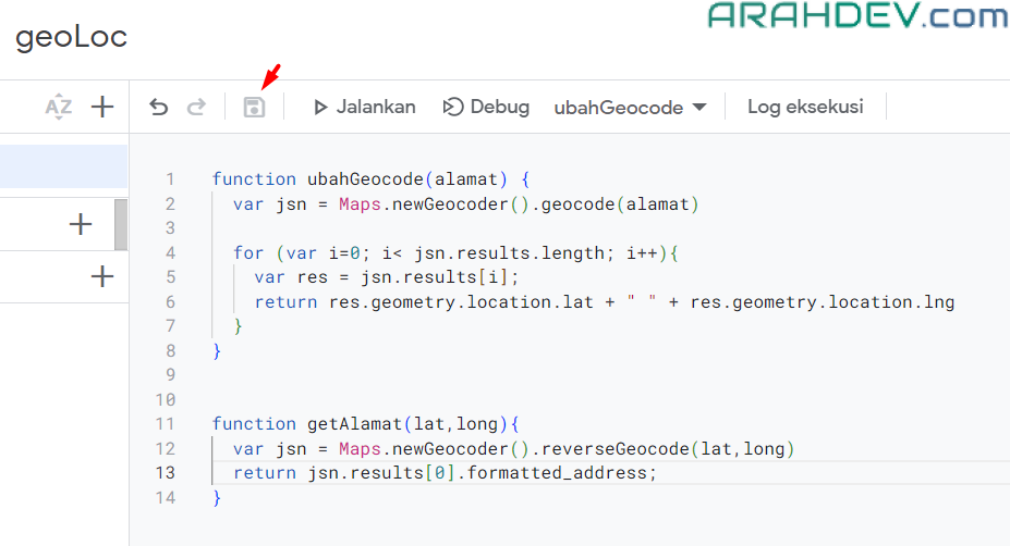 =ubahGeocode()sesuai nama fungsi yang sebelumnya kita buat di app script