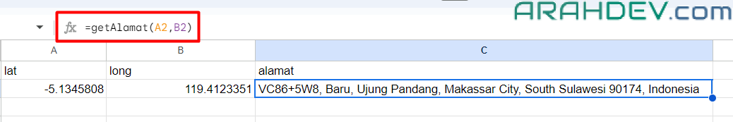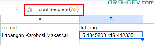 - kita berhasil mendapatkan lat long pada kolom B2 dari input alamat A2