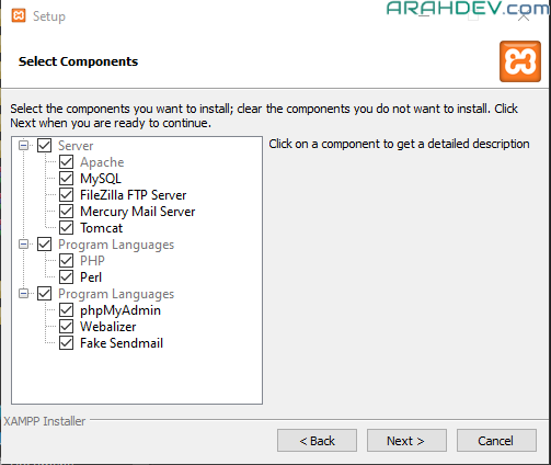 - pilih komponent yang Anda akan instal, secara default akan tercentang semua. Komponent utama yang perlu tercentang adalah apache, mysql, php, phpmyadmin