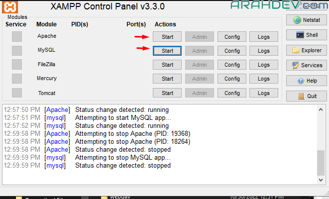 - jika module apache dan mysql telah bewarna hijau maka server berhasil dijalankan