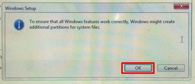 Ketika menklik tombol new akan muncul notifikasi pemberitahuan bahwa selain partisi C: yang kita buat terdapat partisi tambahan dengan ukuran kecil untuk kebutuhan file system. Tekan ok.