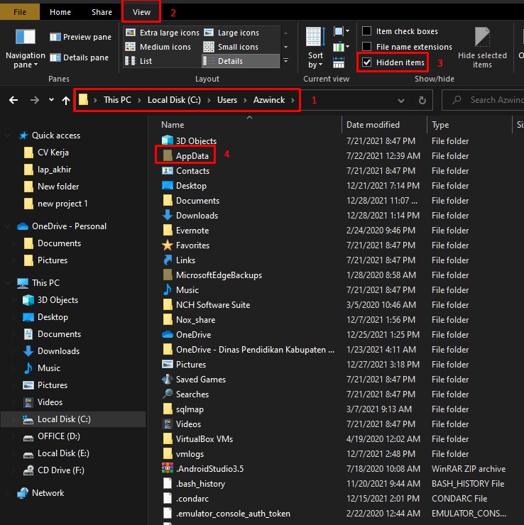 Ketika file hidden telah muncul Anda dapat memilih file dan folder yang Anda akan backup seperti folder downloads, documents, dll. namun saya rekomendasikan untuk tidak menyalin folder appdata karena tidak penting serta beberapa folder dari aplikasi yang mungkin tidak akan digunakan lagi atau akan otomatis terganti ketika aplikasinya di install lagi.