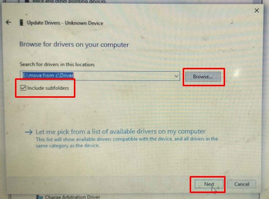 - Pilih browse dan pilih lokasi folder driver yang sebelumnya kita backup. Kemudian ingat untuk mencentang include subfolders. Kemudian klik next.