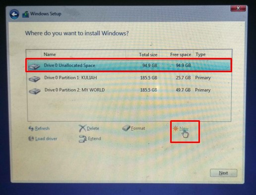 d. Setelah itu, klik button new untuk membuat partisi C: yang baru