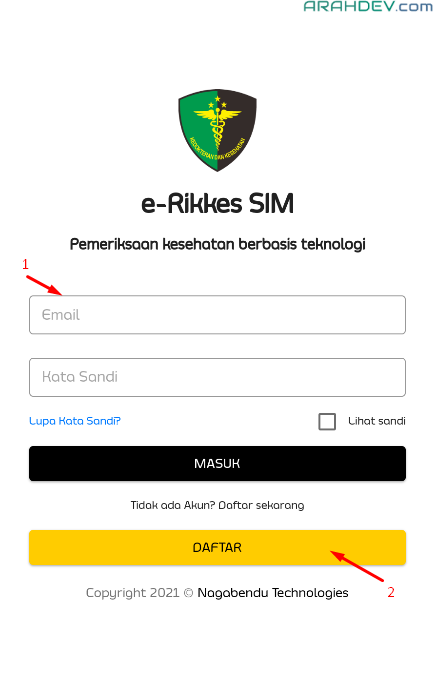 - Selanjutnya jika sudah memiliki akun silahkan masukkan email dan kata sandi Anda kemudian klik masuk (1). Jika belum memiliki akun silahkan klik daftar (2)