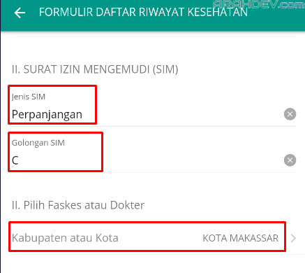 - Pada bagian SIM silahkan pilih jenis sim dan golongan sim. Kemudina pilih kabupaten kota