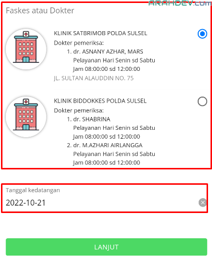 - Selanjutnya pilih lokasi faskes yang ingin dikunjungi untuk test kesehatan pada bagian faskes. Kemudian pilih tanggal kedatangan.